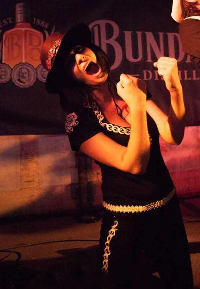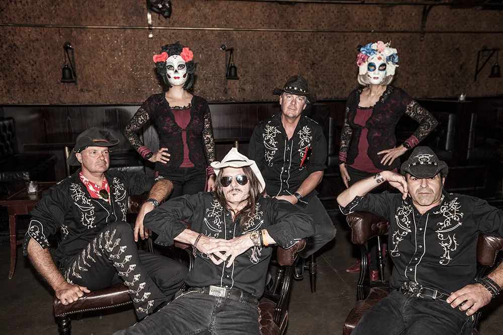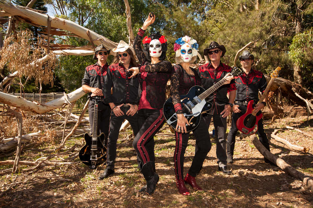 Four guys dressed as cowboys and two women dressed like Spanish Mexican Senoritas that you might find in a Quentin Tarantino movie - two guitarists, a bassist, a drummer a Crazy front man and a beautiful dancer/percussionist. Whilst their original songs have an alt country flavour with rich Cowboy guitar sounds reminiscent of another century the guitar tones also reach into the realms of 60’s surf instrumentals.